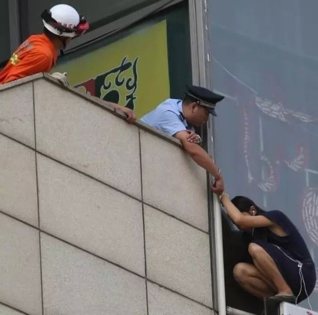 图中的警察把自己和想轻生的女子铐在了一起。
